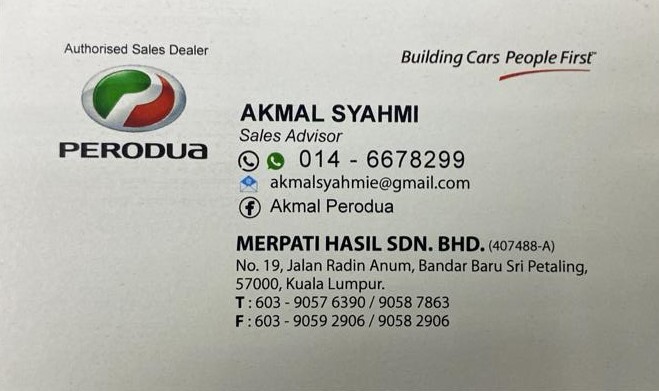 Hai! Nama saya Akmal Syahmi, Sales Advisor Perodua Sri Petaling yang sah. Berpengalaman lebih 5 tahun dalam bidang jualan kereta di Malaysia.